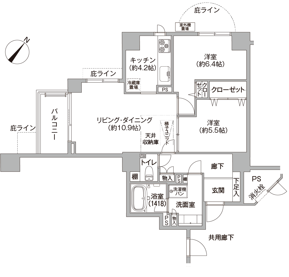 - ◆専有面積の中には、パイプスペース(PS)の一部および物入、住戸内の柱の面積等が含まれています。